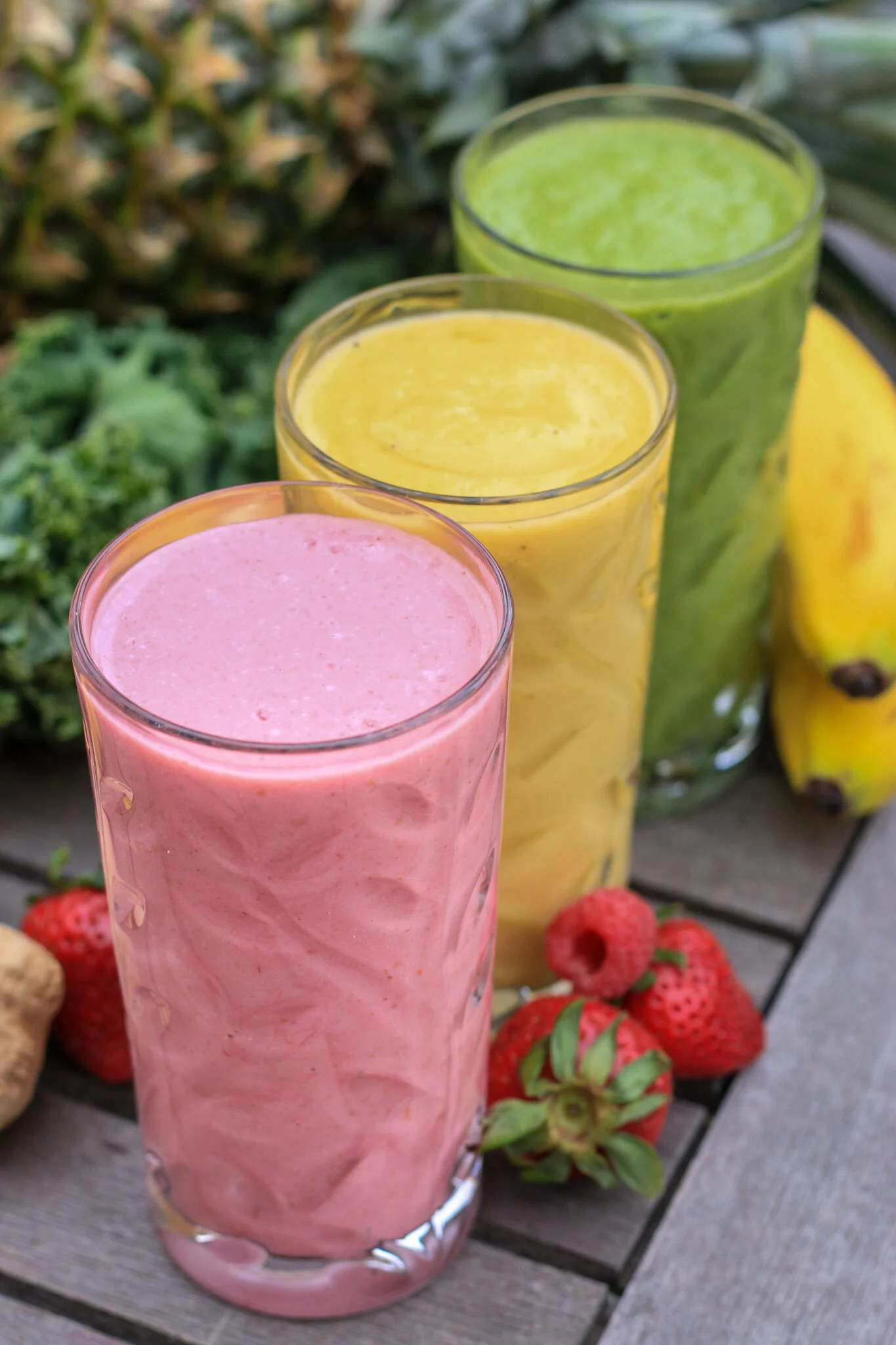 From front to back: Berry Ginger Blast Smoothie, Tropical Sunrise Smoothie, Get Your Greens Smoothie